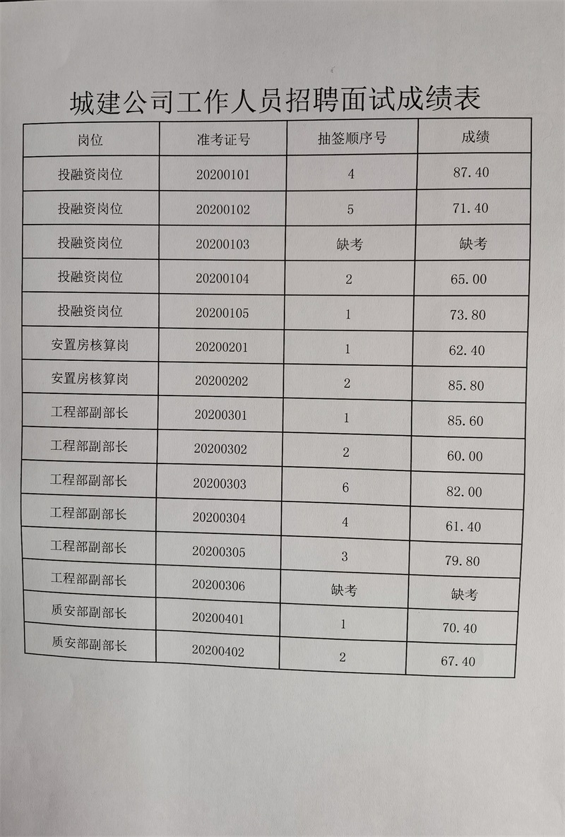宜昌市點(diǎn)軍城鄉(xiāng)建設(shè)開(kāi)發(fā)有限公司2020年公開(kāi)招聘工作人員面試于2020年12月12日結(jié)束,現(xiàn)將面試成績(jī)公示如下,如有疑問(wèn)請(qǐng)于工作日撥打公司電話咨詢。電話為0717-6622026,公示期5天。