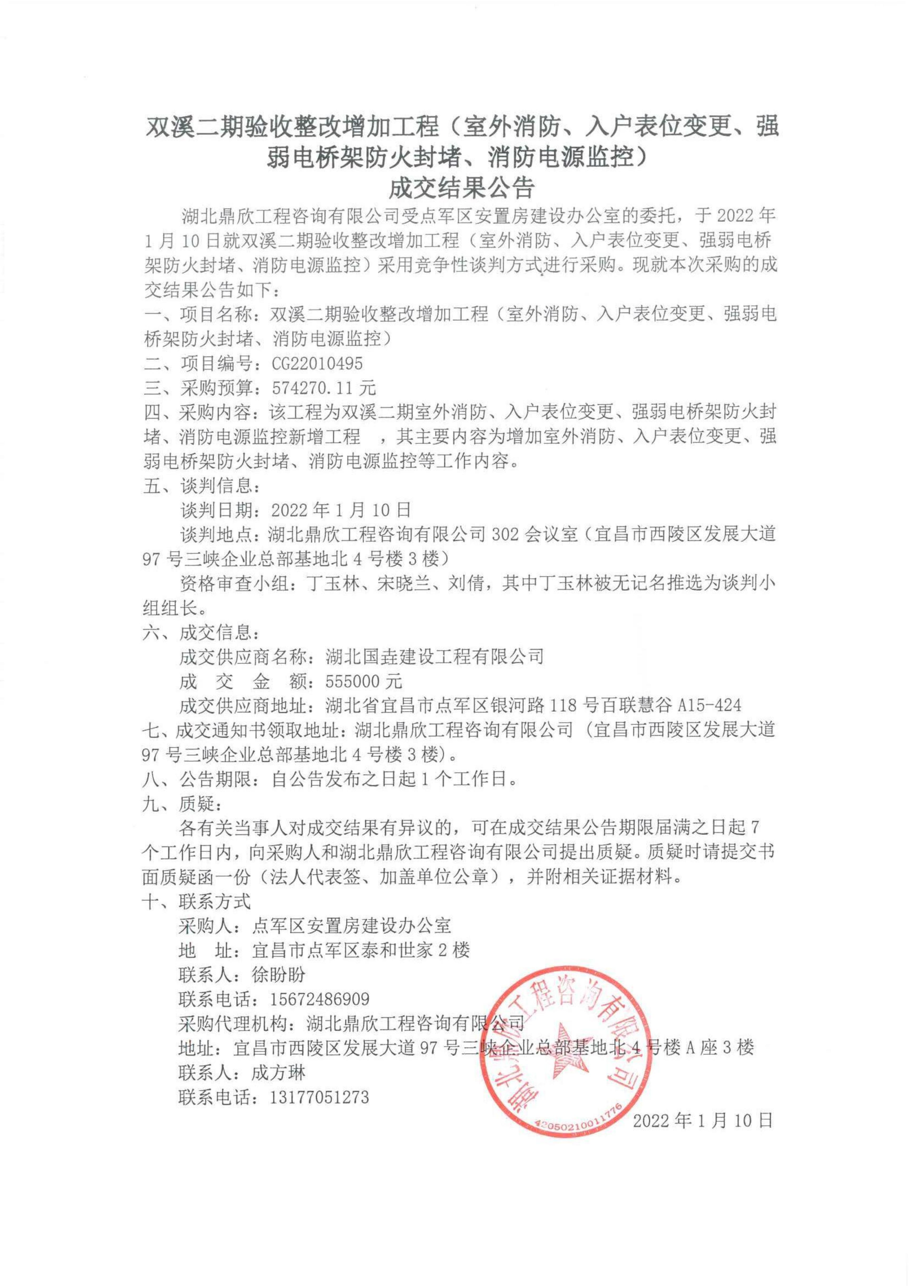 雙溪二期驗(yàn)收整改增加工程(室外消防、入戶表位變更、強(qiáng)弱電橋架防火封堵、消防電源監(jiān)控)?成交結(jié)果公告