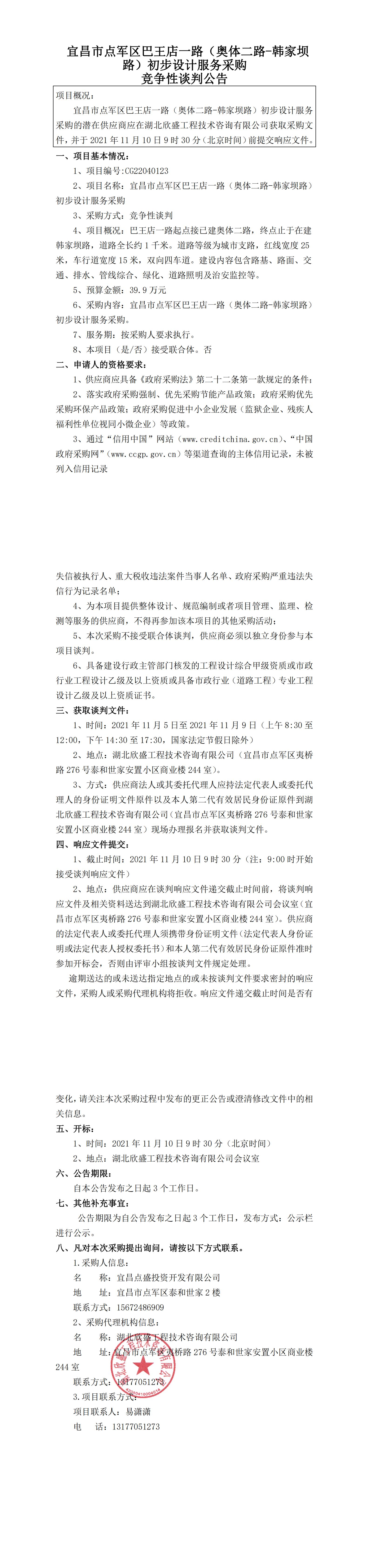 宜昌市點(diǎn)軍區(qū)巴王店一路(奧體二路-韓家壩路)初步設(shè)計(jì)服務(wù)采購(gòu)競(jìng)爭(zhēng)性談判公告