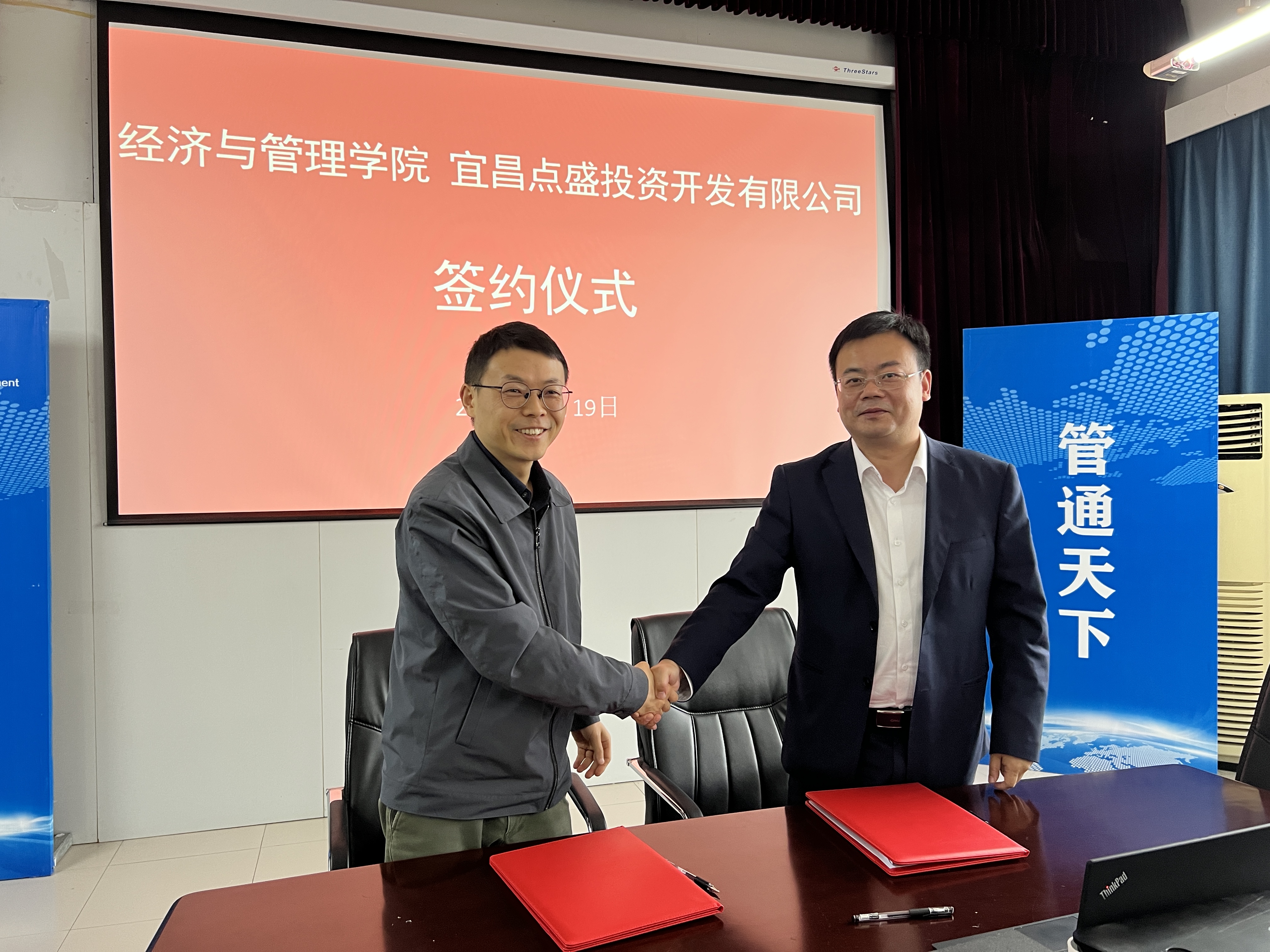 楊濤、覃朝暉代表雙方簽訂了《宜昌點(diǎn)盛投資開發(fā)有限公司與三峽大學(xué)經(jīng)濟(jì)與管理學(xué)院戰(zhàn)略合作意向書》。