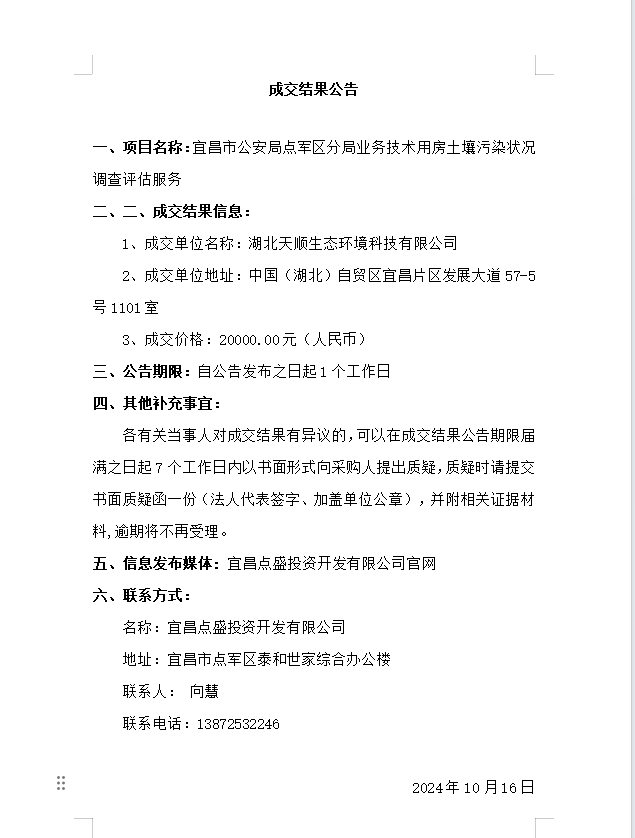 宜昌市公安局點軍區(qū)分局業(yè)務(wù)技術(shù)用房土壤污染狀況調(diào)查評估服務(wù)成交公告