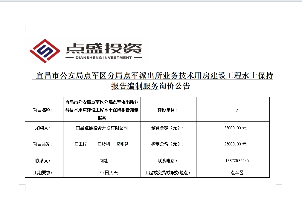 宜昌市公安局點軍區(qū)分局點軍派出所業(yè)務技術用房建設工程水土保持報告編制服務詢價公告