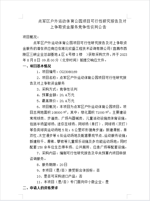 點(diǎn)軍區(qū)戶外運(yùn)動體育公園項目可行性研究報告及對上爭取資金服務(wù)談判公告